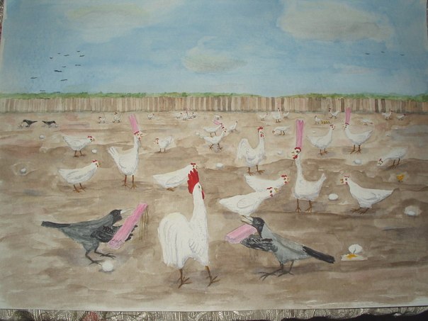 Но в одно прекрасное утро прилетели вороны. Они никого не обижали. Они ни с кем не ссорились. Они просто принесли накладные гребешки и стали обменивать их на червяков. Петухам, у которых гребешки были маленькие, очень хотелось их хоть как-то удлинить, чтобы их тоже уважали. И курам тоже захотелось носить большие гребешки, ведь это так красиво. И тогда все куры и петухи стали приносить червяков воронам и обменивать их на накладные гребешки. А вороны приносили гребешки все более красивые и высокие. За которые нужно было отдавать все больше червяков.