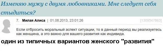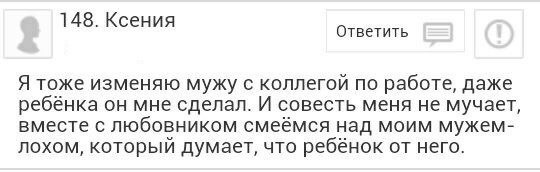 На любом женском форуме таких непотребств - 80% контента. Мрази. Нужно не камнями побивать, а - позорный столб на центральной площади родного города и каленым железом выжечь на лбу клеймо "шлюха". Родителям - вечный позор либо - отречься от твари.
