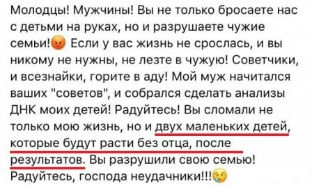 Меня особо позабавили фразы Милы: «…Очень надо понять, чей ребёнок, потому как спать уже не могу, переживаю». Во как! – переживает девочка, печалька у неё. А вот муж Милы не переживает, – не знает ничего. Спит богатырским сном, вымотанный работой на благо семьи, уверенный в том, что уж его-то жёнушка конечно «не такая». А Мила, меж тем, демонстрирует всем, какая она хорошая, ведь её «беременность очень желанная». Мила – не бляdь ни в коем случае, это ведь они побегут на аборт, а наша девочка выносит ребёночка и, конечно же, родит его на радость папе. Вот только жаль всё-таки, что сон у неё несколько сбился. Янка тоже порадовала, умоляет о помощи! Нет-нет, она вовсе не умирает с голоду, её не пытают, над ней не издеваются. Она «умоляет подсказать», кто же отец ребёнка, – вот ведь, как это важно для будущей матери, – такая сложная загадка.