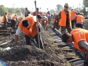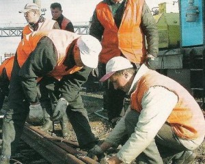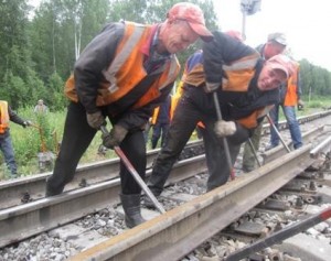 Рельсы носят на специальных захватах типа клещей с длинными ручками. На 25 метровую плеть рельса Р62 весом 1550 кг и норме предельно-допустимых нагрузок для женщины в 7 кг для поднятия одной рельсы требуется 221 баба-шпалоукладчица. Источник информации: «Нормы предельно-допустимых нагрузок для женщин при подъеме и перемещении тяжестей вручную (табл. 2)». http://www.vmc.expo.ru/trud/p_r_work/p_r_work1.ht...