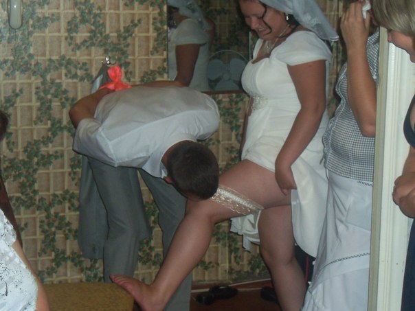 4. «Счастье каждому доступно!» Жениху связывают руки, можно (но не обязательно!) использовать полицейские наручники. Жених должен зубами снять подвязку с ноги невесты. Потом подвязка кидается через плечо в гостей. Тот из мужчин, кто поймает подвязку, надевает её на голову. Значит, ему тоже в следующем году улыбнётся счастье и он женится! Сорри, этот обычай уже есть!