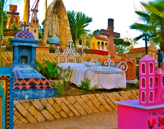 Мексиканское кладбище. Расписные красочные могилы – влияние культуры ацтеков, где смерть – не конец жизни, а жизнь – начало смерти.