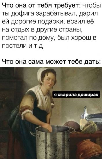 Что получает в браке мужчина? Качественный секс с одной женщиной до её беременности, который обычно сходит на нет, превращаясь в рутину. Обязанности давать секс по закону у женщины нет, права у мужа на секс такие же, как у мужчины с улицы. Мужа по закону так же можно посадить за изнасилование, чего не все знают. При этом мутить с другими женщинами, помимо жены, мужчина уже не сможет. Так что, разнообразия в сексе не будет, да может и самого секса, как говорят женатики, «в браке секса нет!» но это потом! Теоретически мужчине сулятся услуги уборщицы, кухарки, массажистки, мойщицы посуды, стиралки и гладильщицы воротничков. На деле, мужчина может узнать, что его жена «не служанка, не кухарка, не посудомойка!» и получить требование делить домашние обязанности поровну в духе равноправия. Надо сказать, что по закону никаких женских обязанностей на жену не налагается. Впрочем, любой мужчина живший самостоятельно и имеющий две руки со временем понимает, что «домашний труд» в современной городской квартире не стоит и выеденного яйца. Стирает стиралка, чистит пылесос, гладит паровой утюг. Приготовить еду? Имея электричество, воду из крана, газовую плиту, микроволновку и мультиварку – ничего сложного! Можно, при желании, питаться в столовых, кафе, можно заказывать – доставят еду на дом! Помыть за собой 2-3 тарелки и кружку? Одна минута! Хорошо – две! Говорят от женщины в браке мужчина получает эксклюзивную функцию «хранительницы очага». Интересное дело! Давно нет ни пещер, ни очагов! А женщины продолжают эти очаги «хранить»! Реально охраняют они батарею централизованного отопления, ухаживают за ноготками и отращивают попу, посиживая в соцсетях, так это будет выглядеть на деле.