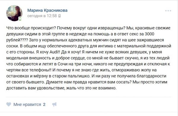 2 Не знаю, откуда и как, но у любой бабы, любого возраста, любой степени некондиции, сколь угодно никакой в постели, есть ценник на пользование звиздой, и рано или поздно, а скорее - рано - она этот ценник выкатит. Ценника на пользование МПХ не существует. Вообще.