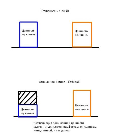 Плата за благосклонность самки © - это и есть суть баборабства, фундамент восприятия скотомужчины. Это не вся правда. Правда в том, что мужчины свято верят в свою ущербность - поэтому готовы дополнительно покрывать свою "недостаточную" ценность ресурсами - априорной ценности бабья. Привожу размышление женщины (цитата): "Если женщина рождается уже со всеми качествами того, чтобы стать счастливой, то мужчине нужно пройти долгий и тернистый путь самосовершенствования и упорной работы над собой, чтобы почувствовать вкус счастья." Рис. 1. - Восполнение искуственно заниженной самоценности мужчины ресурсами для соответсвия уровня априорной ценности бабья без ресурсов. На рисунке изображены взаимоотношения мужчи... показать полностью...