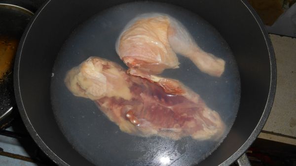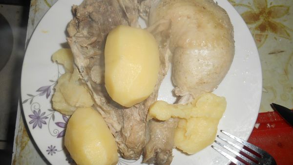 Тем временем, мяско-кура-картофелины сварились. Достаю из бульона, охлаждаю, в бульон отправляю тот картофель, который резанный и сырой