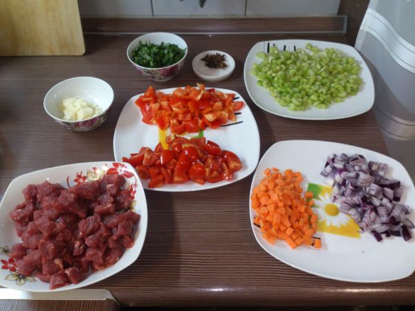 Беру 6 видов мяса, лук, томат паста, стакан рассола, соленые огурцы, картофан, маслины.