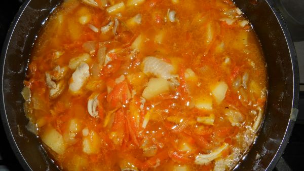 Очень сытная штука, делается с любым мясом-птицей, из баранины очень ароматно получается, но есть надо горячим, потом не торт. Я вот с курой замутил